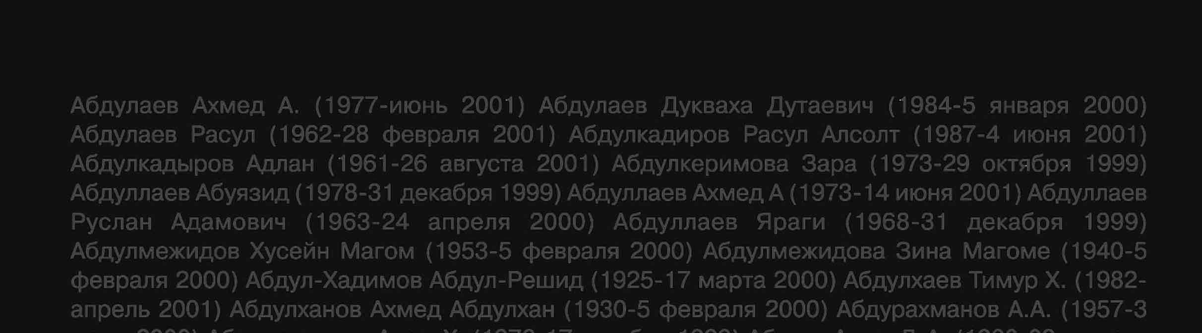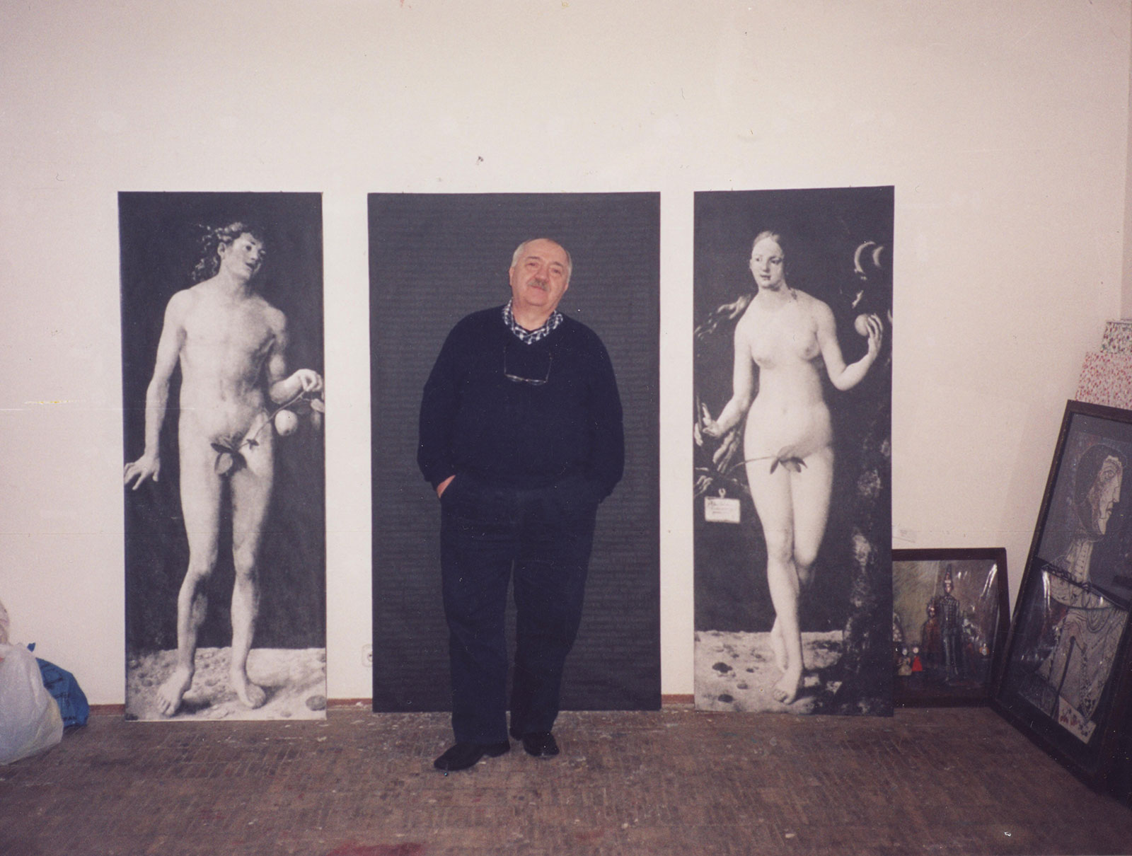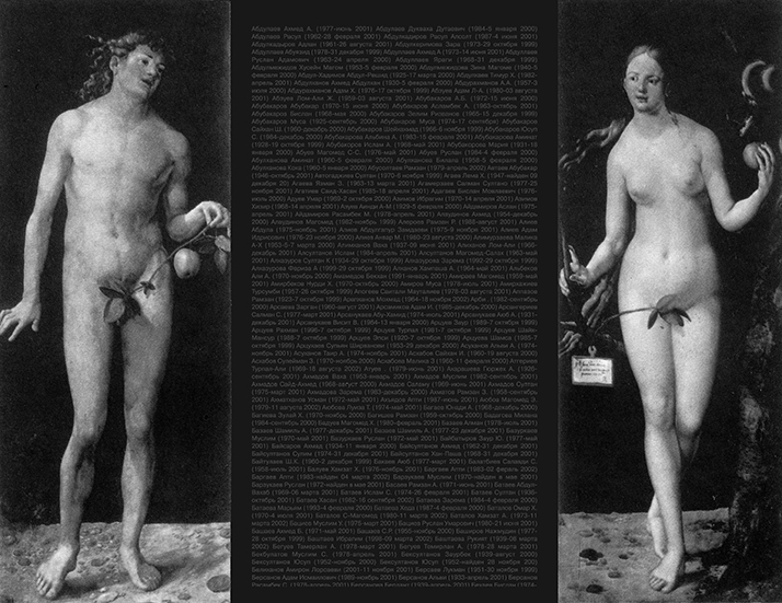 Temo Svirely, in creating the triptych "Adamiani" for the Invasio project, turned to photo installation. "Adamiani," ადამიანი is translated from Georgian as "human." The famous diptych by Dürer was "translated" into a black and white palette of photography, where Adam and Eve found themselves divided by a black "square" of nothingness. After approaching closer, the viewer sees that the black nothingness is covered in small writing: the names of killed Chechen civilians whose last name began with the letter "A". The innocent lives lost create a gap between Adam and Eve, the forebears of humanity, preventing them from uniting. Every human life is priceless. Each of us is a human, an adamiani.